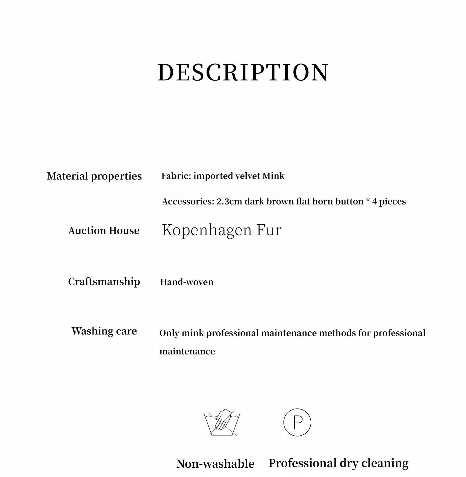 Imported mink combined with hand knitting creates a comfortable, lightweight, and warm feel. The fabric is woven with a three-dimensional, high-density technique, resulting in a full and plump garment with no visible grid. The fine and dense grid spacing, achieved through this technique, provides a thick and warm insulation without exposing the grid. It offers a crisp and structured appearance while also providing an unparalleled, skin-friendly softness.