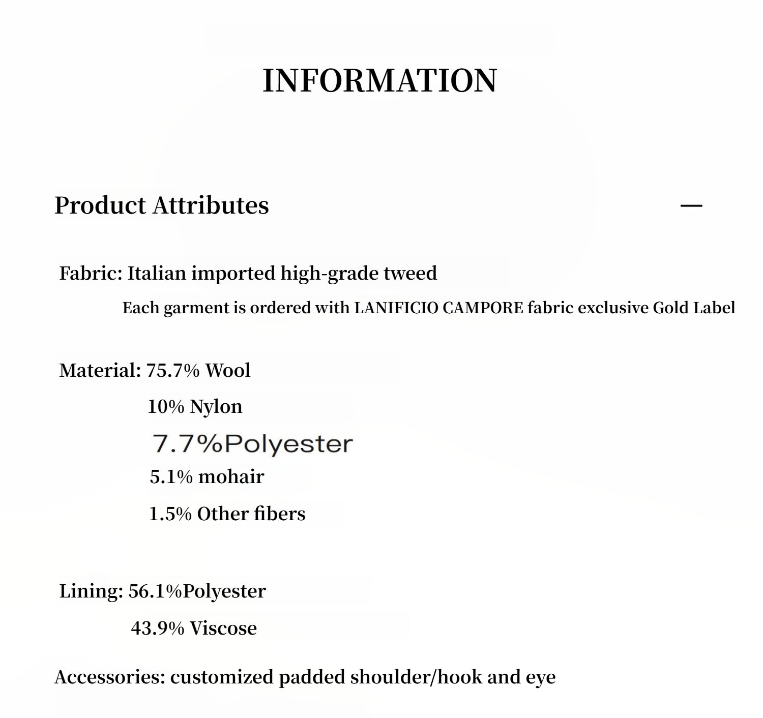 The prestigious Italian brand LANIFICIO CAMPORE is in limited supply. It has a century-old European workshop history and specializes in wool fabric manufacturing. It is a garment partner of Chanel, Dior, and other garments. It is widely used in high-end garment manufacturing and is deeply loved by the fashion industry and celebrities.