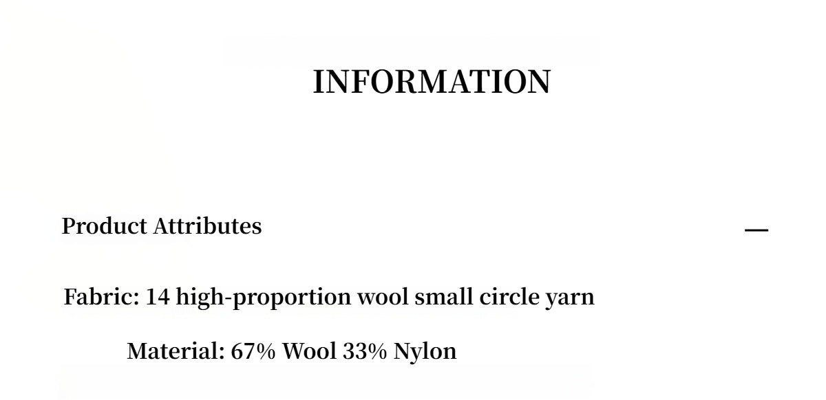 Blended with high-proportion virgin wool and nylon, the yarn is soft yet durable. The unique small loop texture is three-dimensional and plump, offering a soft, skin-friendly touch with a structured feel. It boasts excellent moisture absorption and breathability, keeping you comfortable and non-stuffy.